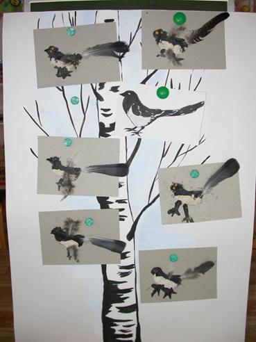 Воспитатель: А теперь давайте возьмем своих птичек и посадим их на дерево рядом с сорокой.