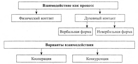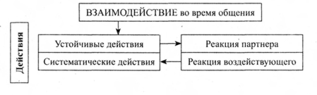 Итак, общение выступает как межличностное взаимодействие, или интеракция, т. е. как совокупность связей и взаимовлияний людей, складывающихся в их совместной деятельности. Например, ученик после урока отдает учителю труда инструмент, которым он работал, а учитель кладет его в шкаф. Обмена информацией здесь не произошло, но взаимодействие состоялось. Следовательно, процесс взаимодействия включает два компонента: