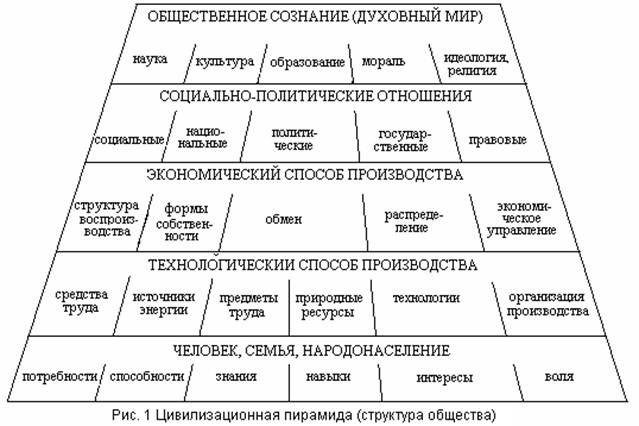 Структуру цивилизации можно представить в виде усеченной пирамиды, которая делится по вертикали на пять этажей, каждый из которых, в свою очередь, включает ряд взаимодополняемых элементов (рис. 1).