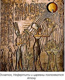 Также как и его отец, Аменхотеп IV в нарушение многовековой традиции женился не на старшей дочери царствовавшего до него фараона (египетский престол формально передавался по женской линии), а на дочери одного из вельмож – Нефертити («Красавица грядёт»). Фараон демонстративно поддержал в качестве противовеса храму Амона-Ра, жрецы которого обладали достаточно большой властью культ малоизвестного бога солнечного диска Атона, удобный для него тем, что за ним не стояли какие-либо влиятельные силы. Возведение фараоном храма Атона в Фивах привело к полному разрыву с культом Амона и его жрецами. Аменхотеп даже сменил свое тронное имя («Амон доволен») на Эхнатон («Угодный Атону»). Более того, он уничтожил имя «Аменхотеп» на отцовских памятниках (что для египтянина было актом отнюдь не символического убийства) и разрушил связанные с ним скульптуры сфинксов, сбросив их с обрыва в окрестностях Фив. Эхнатон объявил, что Атон – истинный бог, т. к. присутствует во всём, что есть во Вселенной, а остальные боги – ложные. Поклонение старым богам было запрещено, строительство храмов прекратилось, жрецы изгонялись, а их имущество конфисковывалось. К пятому году своего правления при поддержке жрецов из Гелиополя – древнего соперника Фив – он перенес царскую резиденцию в новую столицу, за планировкой, строительством и украшением которой