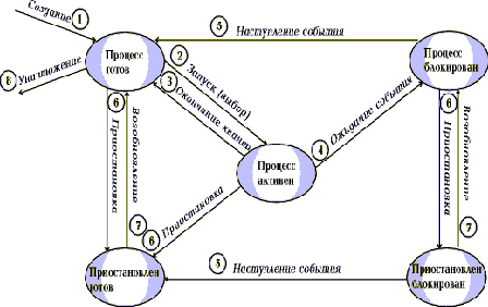 В ходе жизненного цикла каждый процесс переходит из одного состояния в другое в соответствии с алгоритмом планирования процессов, реализуемым в данной операционной системе. Диаграмма переходов процесса представлена на рисунке 1.