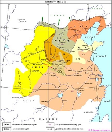 Циньский ван в 221 г. до н. э. объединил бóльшую часть Китая. И хотя Циньская империя существовала очень недолго (до конца III в. до н. э.), но она заложила основы единого централизованного Китая. В это время на всю территорию страны распространяются циньские принципы государственного устройства, создаётся военно-бюрократическая империя, организуются завоевательные походы в Южный Китай и Северный Вьетнам. На севере страны для защиты от кочевых племён активно строится Великая китайская стена.