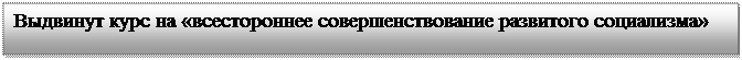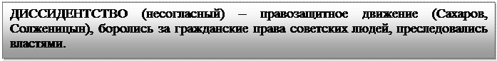 «Расцвели пышным цветом» угодничество, взятничество, коррупция, образуется две идеологии: официальная – партийная; и неофициальная. Многие люди уже не прислушивались к голосу партии, не верили в светлое советское будущее, советский товар означал плохой товар, пытались слушать западные радиостанции, песни запрещенных Галича и Высоцкого, появляется спекуляция.