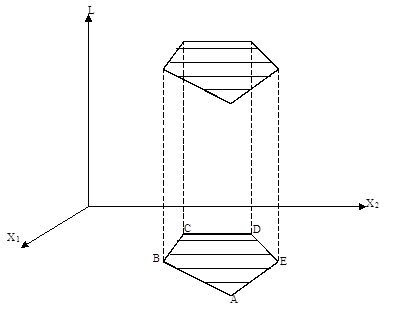 Рассмотрим рис. 2.7, на котором представлена область допустимых значений на плоскости (x1,x2) и поверхность функции цели L(x1,x2). Так как ограничения линейные, то допустимая область представляет собой выпуклый многоугольник. Из-за линейности функции цели