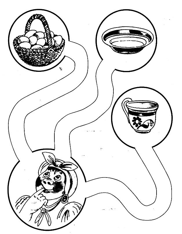5. Развитие зрительного внимания. Положите перед каждым ребенком картинку «Лабиринт» (см. с. 17). Предложите детям рассмотреть лабиринт. Попросите назвать предметы, изображенные в верхней части лабиринта (чашка, тарелка, корзина). Спросите, кто изображен в нижней части лабиринта (баба).