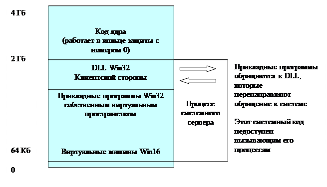 Здесь тоже используется плоская модель памяти. В отличии от Windows 95/98 в гораздо большей степени используется ряд серьезных аппаратных средств защиты, имеющихся в микропроцессоре, а также применено принципиально другое логическое распределение адресного пространства. Все системные программные модули и остальные программные модули самой ОС, выступающие как серверные процессы по отношению к прикладным программам (клиентам), находятся в своих собственных виртуальных адресных пространствах и доступ к ним со стороны прикладных программ невозможен. Логическое распределение адресных пространств приведено на рис.4.