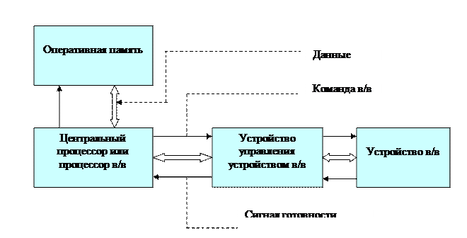 Центральный процессор посылает устройству управления команду выполнить некоторое действие устройству в/в. УУ исполняет команду, транслируя полученный сигналы в сигналы, понятные устройству в/в. Но быстродействие устройства в/в намного меньше быстродействия ЦП. Поэтому сигнал готовности от УУ устройства в/в центральному процессору о том, что операция в/в выполнена и можно подавать новую, приходится ожидать долго. До тех пор, пока сигнал готовности не появится, драйвер внешних устройств ничего не делает, при этом нерационально используется время ЦП. Гораздо более выгодно, подав команду на в/в, на время забыть об устройстве в/в и перейти на выполнение другой команды, а сигнал готовности рассматривать как запрос на прерывание от устройства в/в.