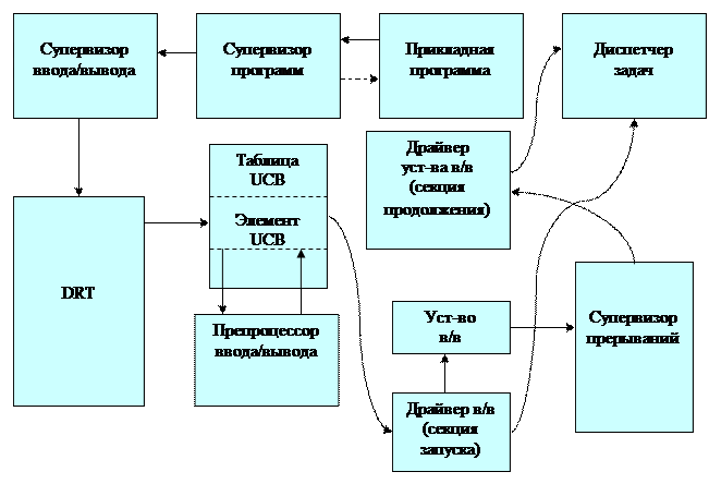 От прикладной программы на супервизор программ поступает запрос на операцию в/в. Он проверяет системный вызов и в случае ошибки возвращает задаче соответствующее сообщение. Если запрос корректен, то он перенаправляется в супервизор ввода/вывода. Последний по логическому имени с помощью таблицы DRT находит соответствующий элемент UCB в таблице оборудования. Если устройство уже занято, то описатель задачи помещается в список задач, ожидающих настоящее устройство. Если же устройство свободно, то супервизор ввода/вывода определяет из UCB тип устройства и при необходимости запускает препроцессор, позволяющий получить последовательность управляющих кодов и данных, которую сможет понять и отработать устройство. Затем управление передается соответствующему драйверу на секцию запуска. Драйвер инициализирует операцию управления, обнуляет счетчик тайм-аута и возвращает управление диспетчеру задач с тем, чтобы он поставил на процессор готовую к исполнению задачу. Система работает своим чередом, но когда устройство в/в отработает посланную ему команду, оно выставляет сигнал запроса на прерывания, по которому через таблицу прерываний управление передается на секцию продолжения. Получив новую команду, устройство вновь начинает ее обрабатывать, а управление процессором опять передается диспетчеру задач, и процессор продолжает полезную работу. Таким образом, получается параллельная обработка задач, на фоне которой процессор осуществляет управление операциями ввода/вывода.