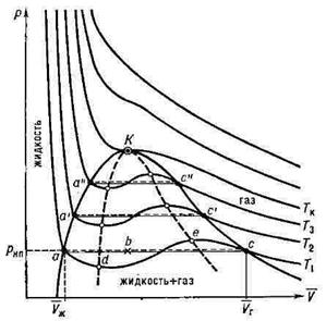 Кривая фазового равновесия P = P (T) жидкой и газообразной фаз вещества оканчивается в так называемой критической точке. Ей соответствуют критическая температура T кр и критической давление P кр. По мере приближения температуры к критической удельные объемы жидкой и газообразной фаз сближаются и в критической точке совпадают. При температурах больше критической (T > T кр) и давлениях вещества больше критического давления (P > P кр) не существует различия между жидким и газообразным состояниями. Понятие о критической точке ввел Д.И. Менделеев (1860).