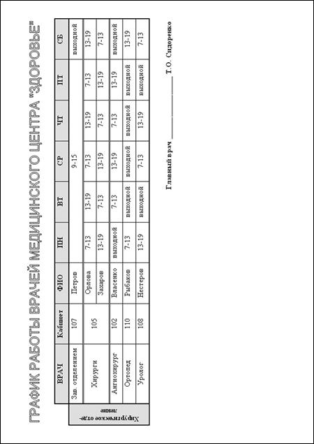 Создайте график работы врачей медицинского центра «Здоровье» в точном соответствии с образцом.
