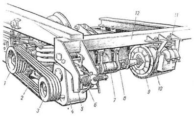 7) натяжное устройство (винт, две пружины и гайка) работает относительно кронштейна, приваренного к раме тележки;