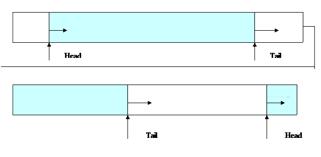 Запись (добавление) одного элемента в пустую очередь делает оба указателя, равными единице. В последующем при добавлении нового элемента увеличивается указатель Tail. Чтение (удаление) элемента производится, начиная с первого элемента созданной очереди. При этом, следовательно, будет увеличиваться указатель Head. Таким образом, в результате операций записи и чтения указатели будут перемещаться от начала массива к его концу. При достижении указателем значения индекса последнего элемента, значение указателя вновь становится равным единице. Массив как бы замыкается в кольцо, организуя круговое перемещение указателей. Сказанное проиллюстрировано на рис. 2.