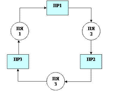 Пусть имеются три процесса ПР1, ПР2, ПР3, которые вырабатывают соответственно сообщения М1, М2, М3. Пусть процесс ПР1 является «потребителем» сообщения М3, процесс ПР2 получает сообщение М1, а ПР3 – сообщение М2 от процесса ПР2, то есть каждый из процессов является и «поставщиком» и «потребителем» одновременно и вместе они образуют «кольцевую» систему передачи сообщений через почтовые ящики (ПЯ) – рис.1.