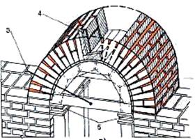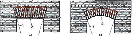 а – кладка клинчатых перемычек; б – кладка лучковых перемычек.