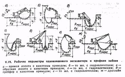 Основные рабочие параметры одноковшовых экскаваторов при разработке выемок, котлованов и траншей: