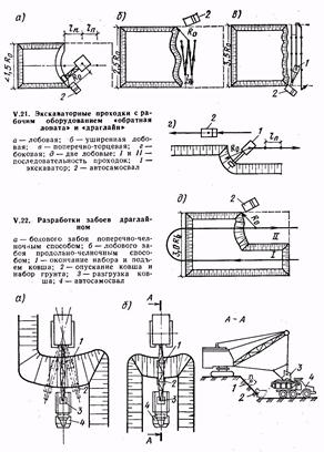Так как ковш драглайна гибко подвешен, эффективными являются челночные способы работы — поперечно-челночный и продольно-челночный (рис. У.22). При поперечно-челночном способе автосамосвал по дну выемки подходит к месту загрузки и загружается попеременным черпанием ковша по обе стороны от кузова. При продольно-челночном способе грунт набирают перед задней стенкой кузова автосамосвалами и, подняв ковш, разгружают его над кузовом. Угол поворота экскаватора при погрузке по продольно-челночной схеме приближается к 0°, а при поперечно-челночной — к 15... 20°; при этом продолжительность разгрузки уменьшается за счет того, что ковш опорожняется без прекращения поворотного движения экскаватора в момент проноса ковша над кузовом машины.
