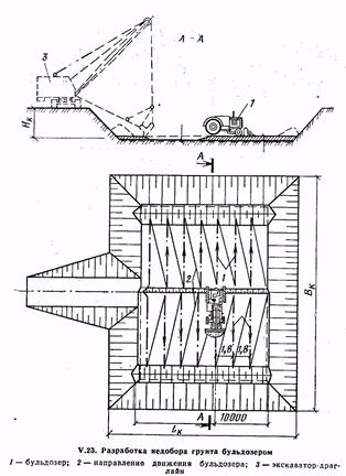 Для разработки недобора грунта применяют также бульдозер. Бульдозер перемещает грунт к нижней бровке котлована челночным способом при рабочем ходе в одном направлении и оставляет защитный слой толщиной 4... 5 см, который зачищается вручную перед устройством фундаментов. Толщина стружки грунта, срезаемого бульдозером за один проход, не превышает 5... 6 см. Число проходов бульдозера устанавливается по месту (рис. V. 23.).