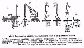 Камуфлетные сваи делают следующим образом (рис. VI. 13). Сначала разбуривают скважину, опускают в нее обсадную трубу. На дно скважины укладывают взрывчатое вещество, которое сверху прикрывается слоем 0,7... 1 м литого бетона». Образовавшаяся бетонная пробка нужна для того, чтобы энергия взрыва была направлена на образование полости в грунте. Полость затем заполняют бетоном и сваю бетонируют обычным способом.
