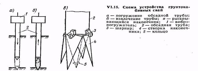 Частотрамбованные сваи (рис. VI. 14) устраивают при помощи специального копра. На копер лебедкой поднимают молот и обсадную трубу, которая в верхней части имеет оголовок. На нижний конец обсадной трубы насаживают металлический башмак со смоляным канатом, чтобы исключить проникание в трубу воды. Под действием ударов молота обсадная труба погружается до проектной отметки. Погружаясь, труба раздвигает частицы грунта и уплотняет его. Затем молот поднимают и в полость трубы опускают арматурный каркас (если сваи армируются). Из вибробадьи через воронку в полость обсадной трубы подают бетонную смесь с осадкой конуса 8... 10 см.