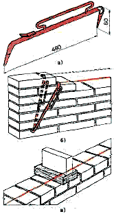 | 11.Порядовка - это рейка 1 сечением 50x50 или 70x50 мм и длиной до 1,8…2 м, на которой через каждые 77 мм нанесены деления (засечки) соответственно толщине ряда кладки. В размер 77 мм входят высота кирпича (65 мм) и толщина шва (12 мм). Порядовки применяют для разметки рядов кладки, фиксирования отметок низа и верха оконных и дверных проемов, перемычек, прогонов, плит перекрытий и других элементов здания. | | ||