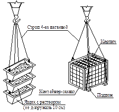 | – металлические растворные ящики вместимостью 0,1 - 0,27 м3; – бункер с двухчелюстным затвором вместимостью 0,75 м3 для подачи кладочного раствора; – поддоны; контейнеры;специальные захваты для подачи стеновых материалов к рабочему месту. | |||