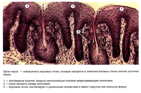| Периферическая | Вкусовые сенсоэпителиальные клетки + чувствительные нейроны ganglion geniculi - в толще височной кости по ходу лицевого нерва (первые нейроны) | Совокупность вкусовых почек, расположенных в эпителии боковых стенок сосочков языка (листовидных, грибовидных, желобоватых) + ganglion geniculi/ |