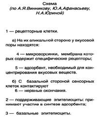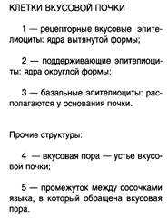 На апикальной стороне этих клеток у вкусовой поры находятся: а) микроворсинки (4), содержащие на мембране специфические белковые рецепторы, и (между микроворсинками) адсорбент (5), имеющий сложный состав и необходимый для концентрирования вкусовых веществ; б)рецепторные белки в микроворсинках настроены на восприятие определенного вкуса. При этом во вкусовой почке часто представлены рецепторы лишь какого-то одного вкуса. Так,