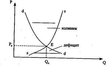 Точка пересечения кривых спроса и предложения соответствует точке (Е), в которой устанавливается равновесная рыночная цена. Как показано на рисунке, точка равновесия — Е, это уровень цены — Ре, которому соответствует определенное количество благ — Ре, и любой Избыток благ данного вида «потеснил бы» его цену вниз, к равновесному уровню. И наоборот, если на рынке ощущается дефицит, нехватка благ данного вида, то возникает «повышательная» тенденция, которая «теснит» цену недостающих благ вверх, по направлению к той же равновесной точке Е, в которой совпали интересы спроса и предложения.