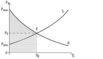 В результате установления равновесия выигрывают и потребители, и производители. Выигрыш (излишек) потребителя возникает в связи с тем, что цена равновесия обычно ниже предлагаемой потребителями цены. Графически — это площадь PmaxEPE (рис.).