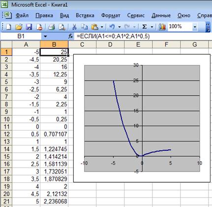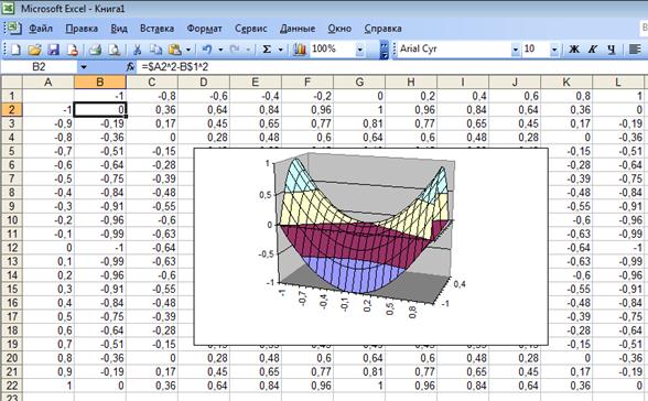 В диапазон B1:L1 введем последовательность значений переменной x: -1, -0.8, …,1, а в диапазон ячеек А2:А12 последовательность значений переменой y. В ячейку В2 введем формулу =$A2^2-B$1^2. Знак $, стоящий перед буквой в имени ячейки, дает абсолютную ссылку на столбец с данным именем, а знак $, стоящий перед цифрой – абсолютную ссылку на строку с этим именем. Поэтому при копировании формулы из ячейки В2 в ячейки диапазона B2:L12 в них будет найдено значение z для соответствующих значениях x, y. Таким образом, будет создана таблица значений z. Для построения поверхности выделим диапазон ячеек A1:L12, содержащий таблицу значений функции. Далее обратимся к Мастеру диаграмм ивыберемтип диаграммы Поверхность. Затем заполним диалоговые окна в соответствии с вариантом задания и получим трехмерный график.