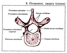 дугу (arcus vertebrae), которая прикрепляется к телу посредством ножек (pedunculi arcus vertebrae) и замыкает позвоночное отверстие (foramen vertebrale). В совокупности отверстия образуют позвоночный канал (canalis vertebralis). - на дуге имеются приспособления для движения позвонков – отростки.