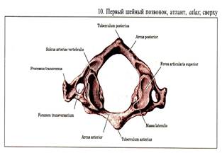 Почти нет тела (отходит к зубу 2 шейного). Передняя и задняя дуги соединены боковыми массами (massae laterales). Поверхности масс служат для сочленения: верхняя (вогнутая) с мыщелком затылочной кости, нижняя (выпуклая) с суставной поверхностью эпистрофея.