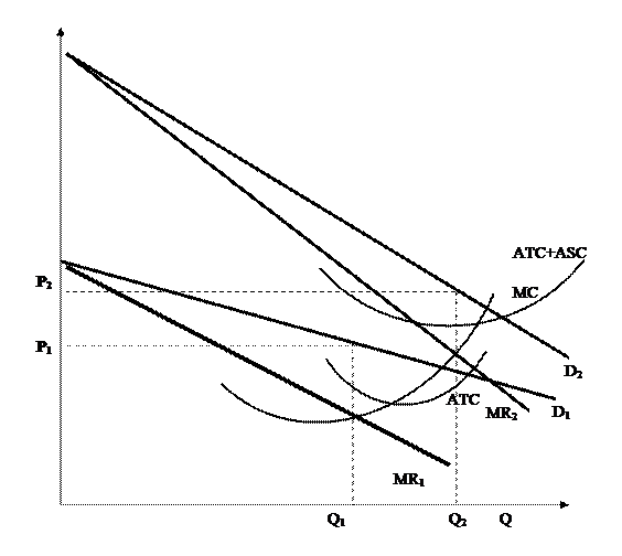 ASC носят характер постоянных затрат, поэтому предельные не меняются. Дифференциация перемещает кривую спроса вправо вверх (увеличение спроса на продукт за счет большей привлекательности), а также может сделать кривую спроса менее эластичной.