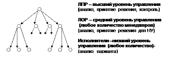В сложной многоуровневой системе управления при использовании человека и/или ЭВМ в качестве ЛОР и ЛПР может быть несколько точек принятия решений на перечисленных выше этапах и уровнях управления. На рис.1.6 - представлен фрагмент иерархической 3-х уровневой структуры