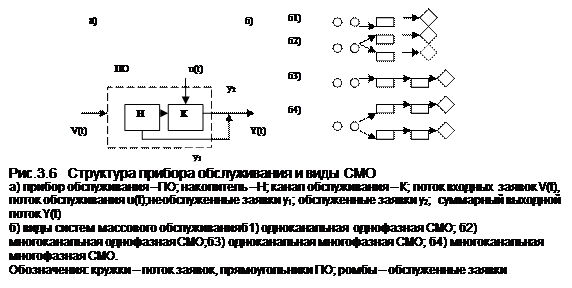На каждый элемент прибора ПОi поступают потоки событий; в накопитель Hi - поток заявок {vi}, на канал Ki - поток "обслуживаний" {ui}. Поток заявок {vi} представляет последовательность времени между моментами появления заявок на входе СМО и образует подмножество неуправляемых переменных СМО. Поток {ui} представляет собой последовательность интервалов времени между моментами начала и окончания обслуживания заявок и образует подмножество управляемых переменных. Заявки, обслуженные каналом Кi и заявки, покинувшие прибор ПОi по различным причинам необслуженными (например, из-за конечности mi или отсутствия времени на ожидание), образуют выходной поток {yi} - последовательность интервалов времени между моментами выхода заявок; это и есть выходной сигнал СМО.