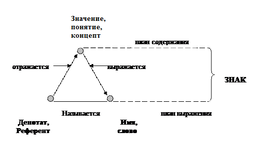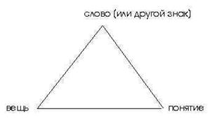 На следующем рисунке воспроизведен знаменитый треугольник с некоторыми дополнениями. Его преимущество перед треугольником Г. Фреге в том, что он разграничивает материальную и идеальную сторону знака (план выражения и план содержания). Фреге же отождествляет знак и имя, что неприемлемо для естественного языка.