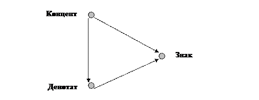 В 1923 г. американские семиотики С.К. Огден и И.А. Ричардс опубликовали книгу с характерным названием: «Значение значения. Исследование влияния языка на мышление и научный символизм». В этой книге предложен семантический треугольник (треугольник Огдена―Ричардса), который представляет собой удачную модель взаимосвязи трех уже известных нам логико-лингвистических категорий: