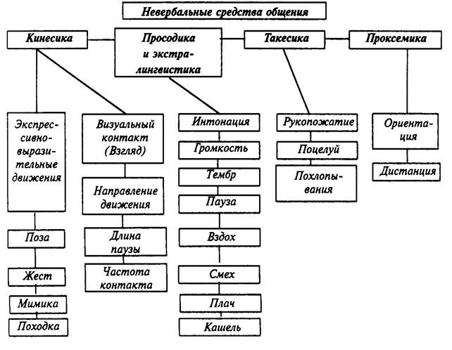 Невербальная коммуникация осуществляется всегда при личном контакте. Эти средства, как известно, могут сопровождать речь, а могут и употребляться отдельно от вербальных средств. Невербальные знаки могут быть разделены на три основные группы: язык тела, паралингвистические средства, одежда и украшения.