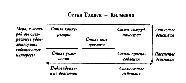 Стиль поведения в конкретном конфликте, замечают они, определяется той мерой, в которой вы хотите удовлетворить собственные интересы, действуя при этом пассивно или активно, и интересы другой стороны, действуя совместно или индивидуально. Если представить это в графической форме, то получим сетку Томаса - Килменна, позволяющую проанализировать конфликт и выбрать оптимальную стратегию поведения. Она в свою очередь позволяет для каждого человека создать свой собственный стиль разрешения конфликта.