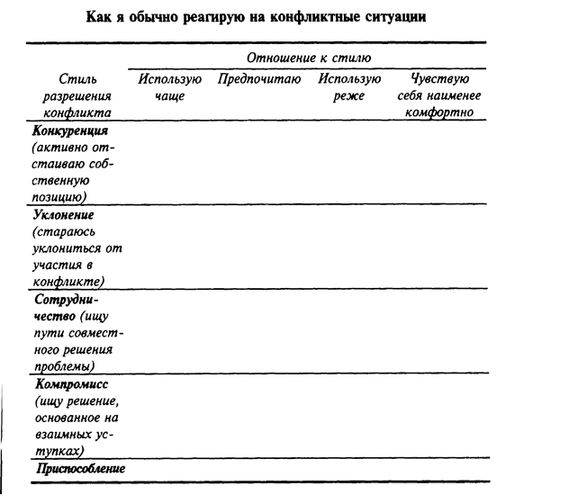 Однако чтобы определить, какой стиль наиболее удобен и лучше всего для вас с точки зрения комфортности, заполните приводимую ниже таблицу. Отвечая на вопросы, постарайтесь записать первый ответ, который пришел вам в голову, поскольку он наиболее правилен, ибо соответствует непосредственной и интуитивной реакции, и не задумывайтесь над тем, какой подход было бы правильно применить в тех ситуациях, с которыми сталкивались в последнее время. Это позволит в дальнейшем вам корректировать свой стиль поведения и определить, насколько комфортно себя чувствуете, применяя предпочитаемый подход, и что можно получить, развивая свои способности в использовании других стилей.
