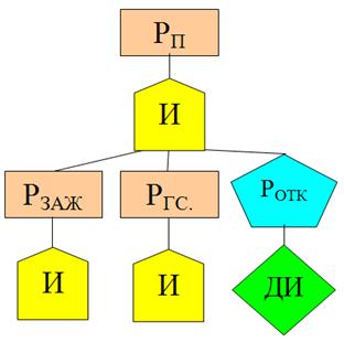 Вероятность возникновения и развития пожара в помещении РП (оператор «И») определяется вероятностью возникновения условий для зажигания РЗАЖ («СВЛЭ»), образования горючей смеси РГС («СВЛЭ») и возможным отказом систем тушения пожара РОТК («СМСИН») и т. д.