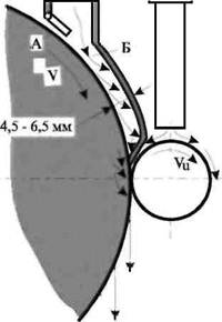 Рис. 7.1 Поток воздуха вокруг круга отсекается клапаном А, создавая в полости Б сопла разреженное пространство. В эту полость устремляется струя жидкости, разгоняется, создавая у выхода сопла определенное давление, и выходит в зону резания через поры круга, как это показано на рис. 7.1, и через зазор между передним козырьком сопла и поверхностью круга. По мере износа круга клапан А раскрывается больше, увеличивая подачу жидкости. Ширина сопла должна перекрывать ширину (высоту) круга и охватывать его по торцевым поверхностям. Способ не требует большого расхода и тонкой очистки жидкости и не вызывает сильного разбрызгивания при частоте вращения круга до 60 — 80 м/с.