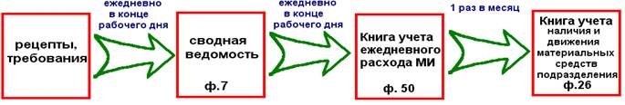 - ядовитые и наркотические средства, спирты, дорогостоящие, дефицитные лек средства ежедневно записывается в сводную ведомость ф.7, итоговые данные которой заносятся в книгу учета ежедневного расхода мед имущества ф.50. К сводной ведомости подшиваются требования и рецепты. На основании итоговых данных книги учета ф.50 ежемесячно производится списание расходного имущества с книги учета ф. 26.