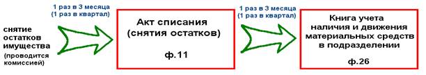 - остальное расходное имущество 1 раз в 3 месяца списывается с основного учета по фактическому расходу на основании акта списания (снятия остатков) ф.11. По этому же акту списываются и предметы, израсходованные в процессе изготовления лекарств (вата, марля, посуда, пакеты, капсулы и т.д.).
