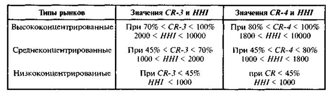 Чем меньше ННI, тем меньше концентрация, тем при прочих равных условиях сильнее конкуренция на данном рынке и тем слабее рыночная власть отдельных предприятий. Для конкурентного рынка (если число предприятий на нем превышает 100) HHI стремится к единице, Для монопольного рынка — к 10000 В соответствии с различными значениями коэффициентов концентрации и коэффициентов Герфиндаля—Гиршмана по степени концентрации выделяются три типа рынков: высоко, средне- и низкоконцентрированные: