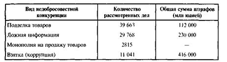 Количество рассмотренных ГПТАУ Китая дел по основным видам недобросовестной конкуренции за 2000—2003 гг. представлено в таблице.