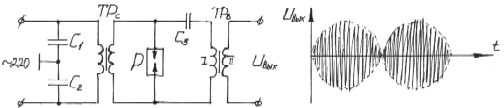 При подключении питания к осциллятору трансформатор ТРС повышает напряжение, конденсатор С3 заряжается. При определенном напряжении на конденсаторе С3 происходит пробой разрядника Р и конденсатор С3 через разрядник разряжается на индуктивность L первичной обмотки трансформатора ТРВ. В цепи возникает затухающий колебательный процесс.