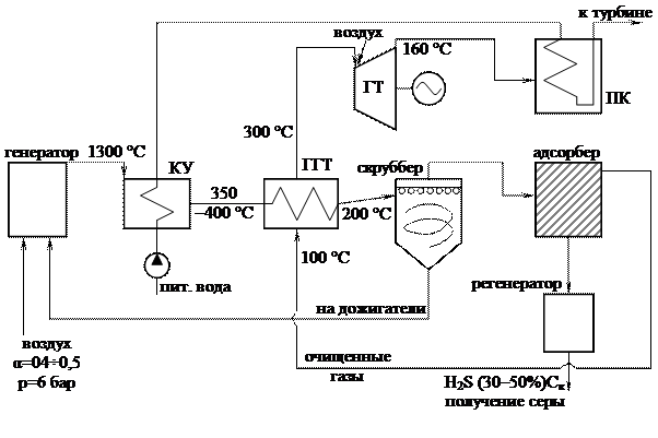 Продукты газификации направляют из генератора в котел – утилизатор (включен в основную схему ТЭС), где они охлаждаются с 1300