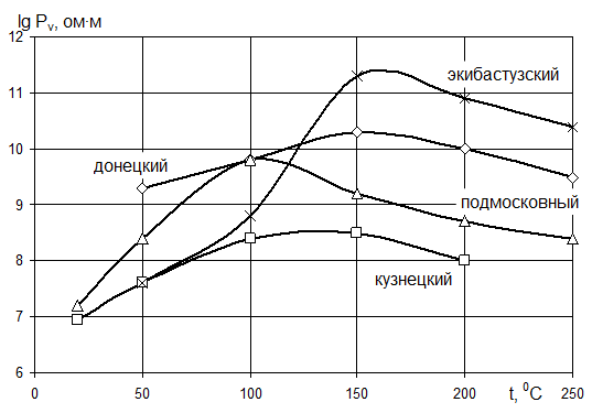 Рис. 8.3. Удельное электросопротивление летучей золы топлив