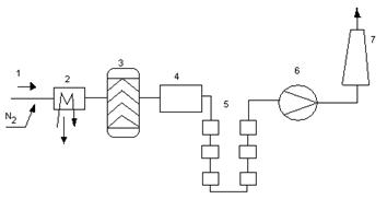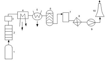 1 – трубопровод подачи газов; 2 – теплообменник охлаждения до 10–20 ºС и конденсации водяных паров; 3 – аэрозольный стекловолокнистый фильтр; 4 – цеолитовый или силиконовый фильтр (осушка); 5 – адсорбер (хроматографическая колонна);